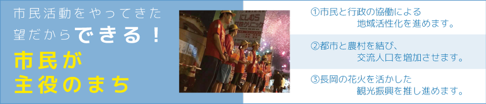 私は、「改革はまず議会から」を自らの行動指針として、市民幸福度の高い長岡市の創造に邁進していきます。