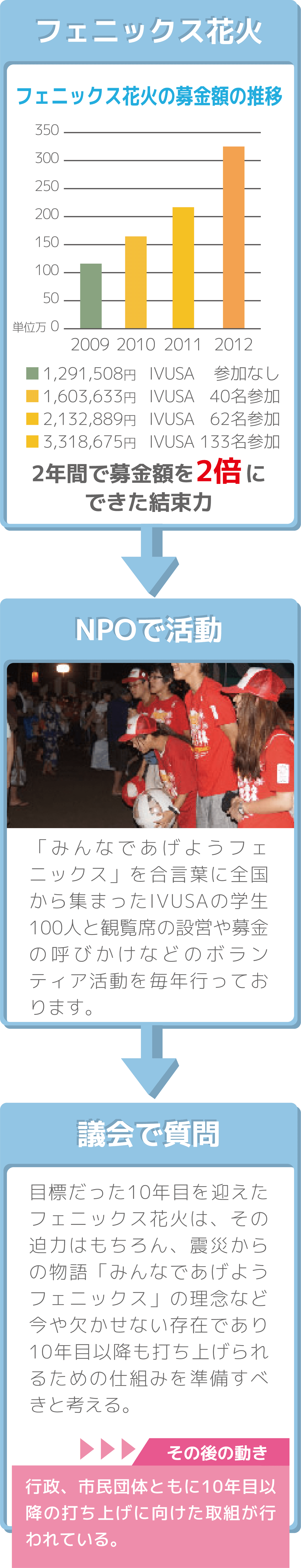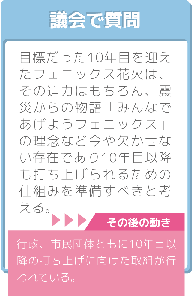 フェニックス花火は、震災からの復興を祈願して「みんなであげようフェニックス」の理念のもと、多くの方の協賛金により打ち上げられました。