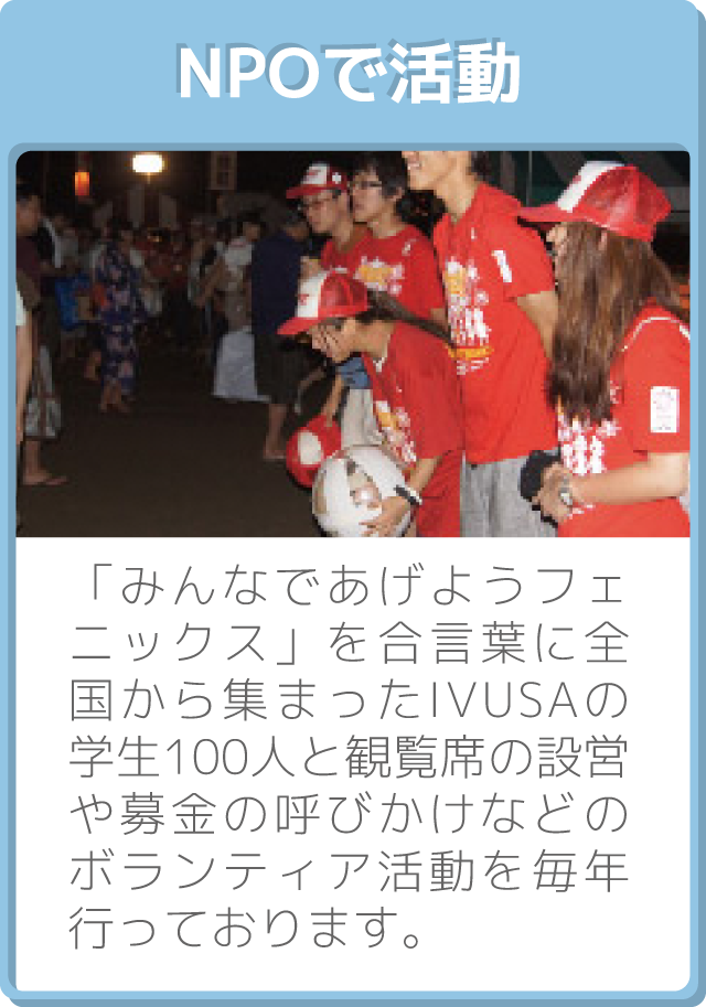 毎年、100名を超える大学生が全国から長岡へ集まります。そしてフェニックス花火打ち上げのための募金活動や観覧席の設営のボランティアを行います。このようなボランティアの活動によってフェニックス花火は打ち上げられています。